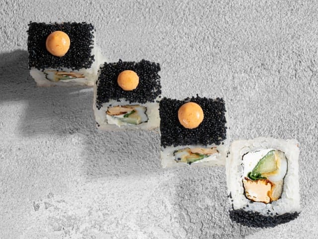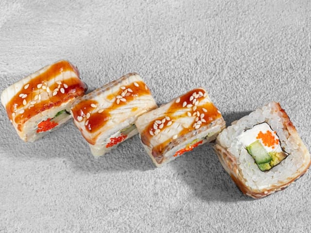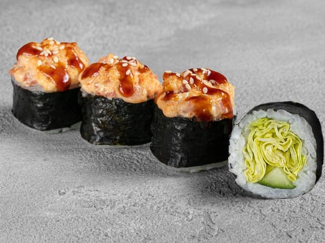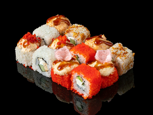 А также икрой тобико, свежим огурцом, омлетом и креметто, политый соусом терияки
