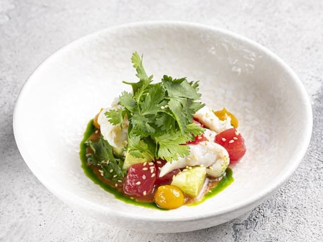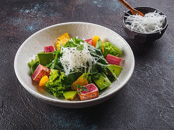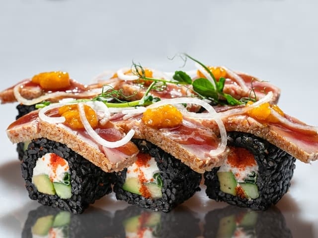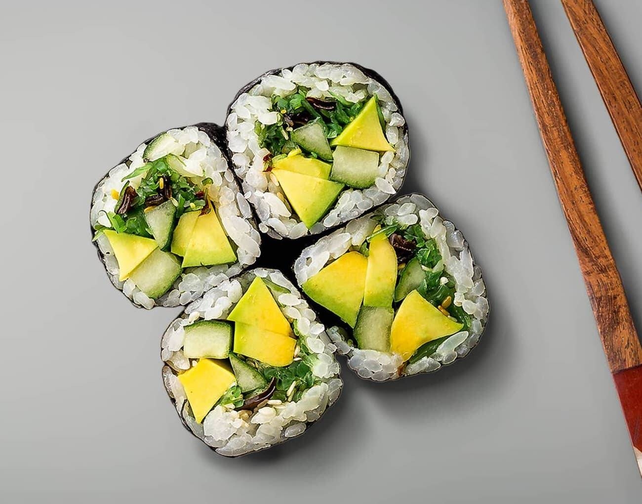 4шт. Ролл с тунцом, авокадо, кинзой, нори и рисом. Соус соевый, имбирь, васаби.