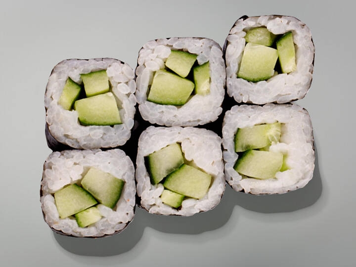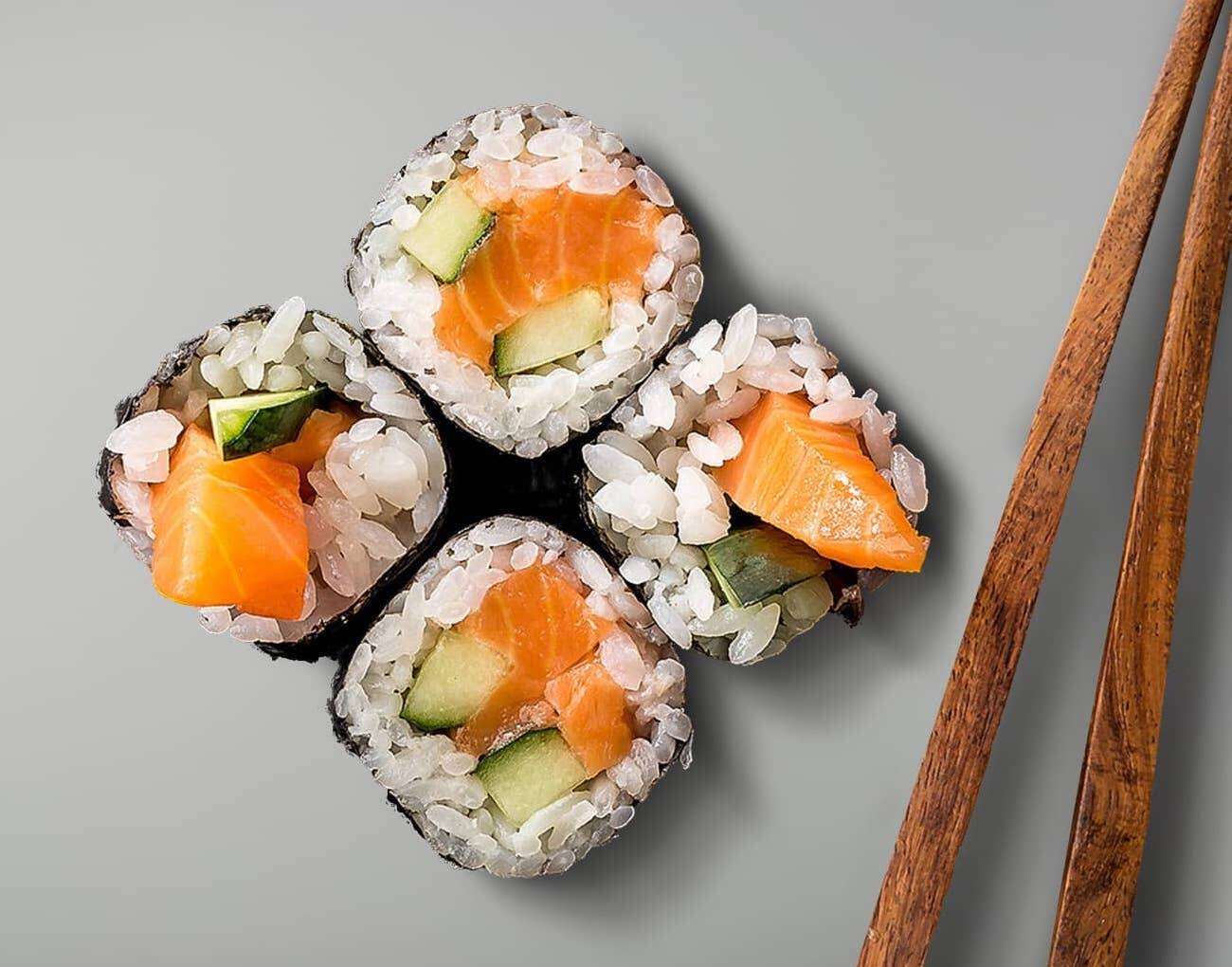 4шт. Ролл с лососем, огурцом, нори и рисом. Соус соевый, имбирь, васаби.