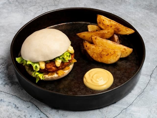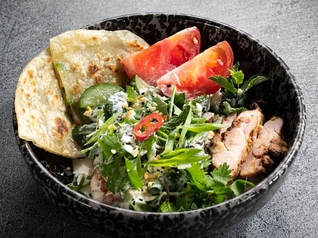 А также нежным творожным сыром, свежим огурцом и зеленым луком с пикантным соусом спайси