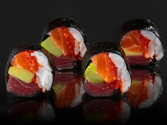 Яркий, как радуга: тунец, лосось и креветка с авокадо, огурцом и нежным сливочным сыром