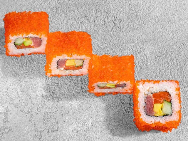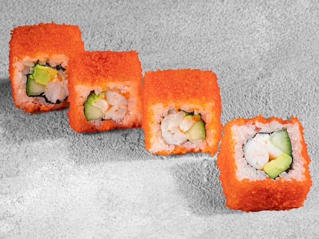Ролл с тигровой креветкой, авокадо, огурцом, майонезом, обваленный в икре тобико